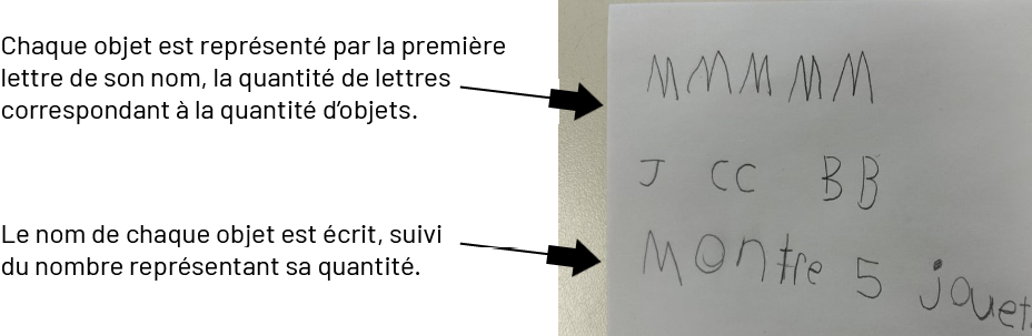 • Qu’est-ce qui est semblable entre la représentation avec des dessins et celle avec des lettres? entre la représentation avec des lettres et celle avec des mots? (Elles représentent les mêmes quantités d’objets.)