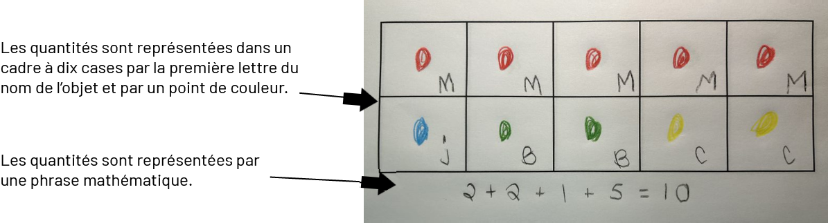 Certaines et certains élèves utilisent une seule couleur pour représenter les différents objets dans le cadre à 10 cases. D’autres ajoutent la 1re lettre du nom de l’objet à côté de chaque point.