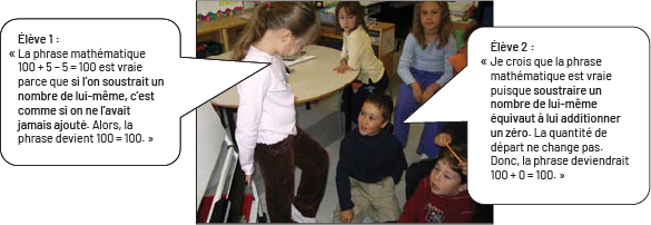 négocient leur raisonnement mathématique. « Élève un » dit « La phrase mathématique cent plus 5 moins 5 égale cent est