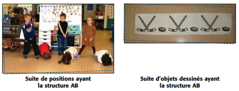 image: 6 enfants réalisant une suite avec les corps. Ils alternent entre la position debout et la position allongée sur le sol, 3 fois.La légende se lit ainsi « suite de positions ayant la structure « A,» « B. »Un dessin d'une série d'objets, 2 crosses de hockey, un palet, répété 3 fois.La légende se lit ainsi « suite d’objets dessinés ayant la structure « A » « B. »
