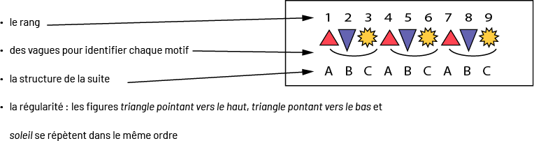 Afin de bien saisir les concepts sous-jacents à la grande idée de régularités et de relations, voici quelques notes explicatives sur le vocabulaire mathématique lié aux suites non numériques.