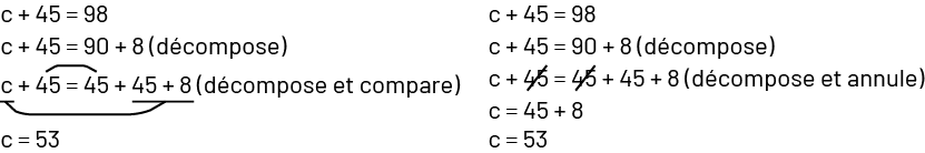 Image « c » plus 45 égal 98 « c » plus 45 égal 90 plus 8 « décompose ». « c » plus 45 égal 45 plus 45 plus 8 « décompose et compare ». « c » égal 53 Un trait fait un lien entre le « c » et le 45 plus 8. « c » plus 45 égal 98 « c » plus 45 égal 90 plus 8 « décompose ». « c » plus 45 égal 45 plus 45 plus 8 « décompose et annule ». « c » égal 53 Un 45 de chaque côté de l’égal est barré à la troisième ligne.