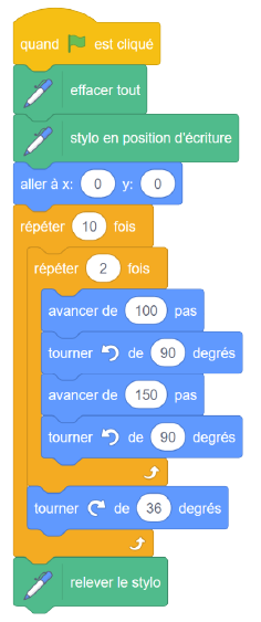 Image Blocs de codage attachés les uns aux autres; Bloc d’évènement : départ drapeau vert. Bloc de stylo : effacer tout. Bloc stylo : stylo en position d’écriture. Bloc de mouvement : aller de « x » zéro, « y » zéro. Bloc de contrôle : répéter dix fois. Bloc de contrôle : répéter 2 fois. Bloc de mouvement : avancer de 100 pas. Bloc de mouvement : tourner vers la gauche de 90 degrés. Bloc de mouvement : avancer de 150 pas. Bloc de mouvement : tourner vers la gauche de 90 degrés. Répéter. Bloc de mouvement : tourner vers la droite de 36 degrés. Répéter. Bloc stylo : relever le stylo.