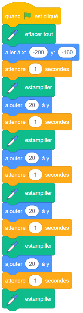 Bloc de stylo : estampiller. Bloc de mouvement : ajouter 20 à « y ». Bloc de contrôle attendre une seconde. Bloc de
