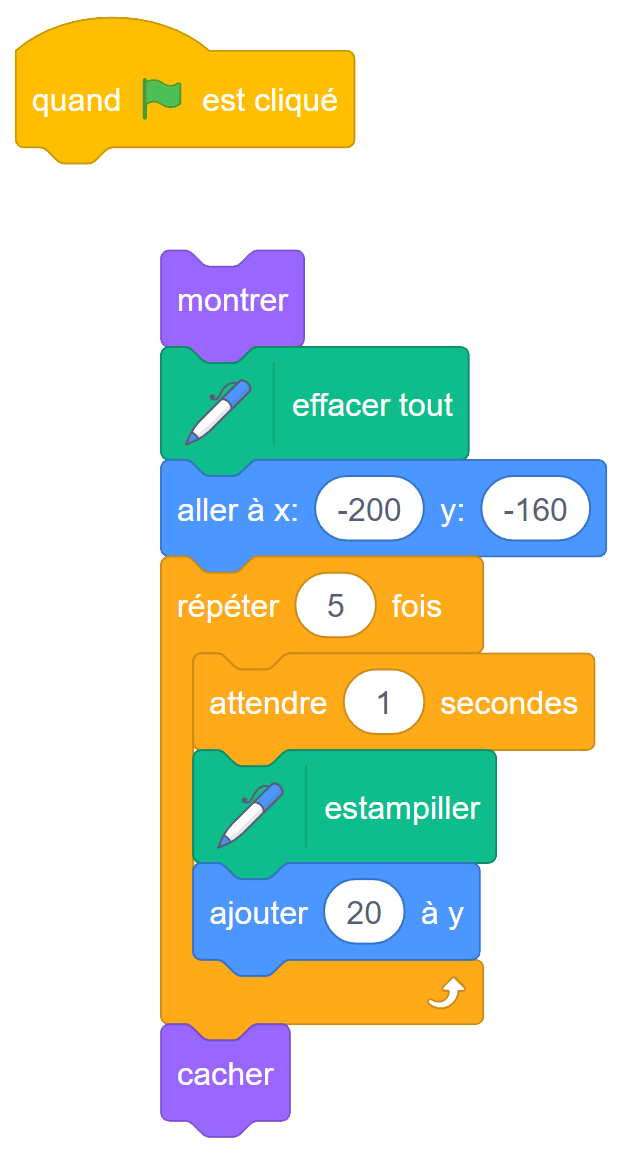 Image Bloc d’évènement : départ drapeau vert. Blocs de codage attachés les uns aux autres; Bloc d’apparence : montrer. Bloc de stylo : effacer tout. Bloc de mouvement : aller à « x » moins 200, « y » moins 160. Bloc de contrôle : répéter 5 fois. Bloc de contrôle : attendre une seconde. Bloc de stylo : estampiller. Bloc de mouvement : ajouter 20 à « y ».