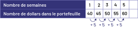 On peut représenter la relation entre le nombre de dollars dans le portefeuille de Dominique d’une semaine à l’autre par une table de valeurs. Chaque terme augmente d’une valeur de 5.
