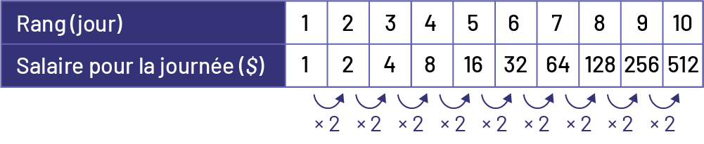 | Salaire pour la journée ($) | 1 | 2 | 4 | 8 | … |