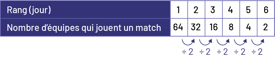 image Table de valeurs qui représente le rang en jour et le nombre d’équipes qui jouent un match. Rang un : 64 équipes. Rang 2 : 32 équipes.Rang 3 : 16 équipes. Rang 4 : 8 équipes. Rang 5 : 4 équipes. Rang 6 : 2 équipes. Des flèches représentent les bonds de diviser par 2.