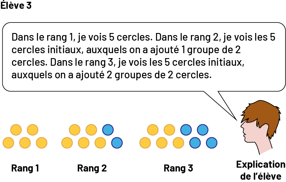 Il est important de reconnaître que le cheminement vers l’expression d’une règle peut différer d’une ou d’un élève à l’autre, puisque le raisonnement se développe à partir de perceptions individuelles. L’exemple suivant, inspiré d’une recherche de Radford (2006, p. 2-21), illustre comment des élèves peuvent percevoir différemment la relation entre le rang de la figure dans une suite non numérique à motif croissant et le nombre de cercles qui le composent.