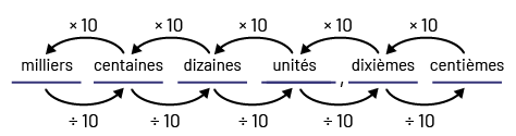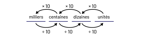 image Sur une ligne on peut lire : milliers, centaines, dizaines, unités. Des flèches passent d’un mot à un autre, de la gauche vers la droite, elles représentent le bond multiplié par dix. Des flèches passent d’un mot à un autre de la droite vers la gauche et représentent le bond divisé par dix.
