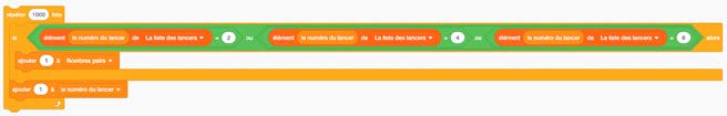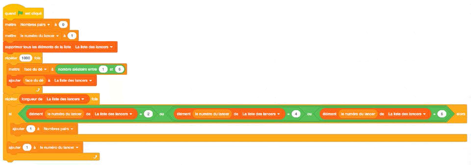 image Un bloc de codage commençant par un bloc de contrôle qui montre « quand » un drapeau vert « est cliqué ». Empilé sur le bloc variable suivant qui montre le mot « mettre » puis « Nombres pairs » avec une flèche vers le bas, à côté de cela « à » « Zéro » dans une bulle. Empilé sur le bloc de variables suivant qui affiche le mot « mettre » puis « le numéro du lanceur » avec une flèche vers le bas, à côté de ce « à » « Zéro » dans une bulle. Le bloc suivant est un bloc de correction marqué « supprimer tous les éléments de la liste » avec une bulle marquée « La liste des lanceurs » et une flèche vers le bas. La séquence de répétition commence ensuite par un bloc de contrôle qui affiche « répéter », « mille » dans un cercle suivi du mot « fois ». Des blocs variables sont intégrés dans ce bloc. Le bloc marqué « mettre » puis « Face du dé » avec une flèche vers le bas, à côté de cela « à » et une plage qui se lit « nombre aléatoire entre » avec « un » dans une bulle et « et » « 6 » dans l'autre bulle. Le tout est empilé sur un bloc marqué « ajouter » et « face du dé » dans une bulle « à » « La liste des lanceurs » avec une flèche vers le bas. Ce bloc présente une flèche qui part du bas dans le sens inverse des aiguilles d'une montre. Le bloc de répétition suivant commence par le bloc marqué « répéter » et « longueur de » « La liste des lancers » ainsi qu'une flèche descendante et le mot « fois ». Il est empilé sur une séquence conditionnelle marquée par le bloc « si ». Elle contient deux variables marquées « élément » puis « le numéro du lanceur » dans une bulle « de » « La liste des lanceurs » avec une flèche descendante égale « 2 » dans une bulle ou « élément » puis « le numéro du lanceur » dans une bulle « de » « La liste des lancers » avec une flèche descendante égale « 4 » dans une bulle ou « élément » alors « le numéro du lancer » dans une bulle « de » « La liste des lancers » avec une flèche descendante égale « 6 » dans une bulle, « alors ». Ce bloc est empilé sur un bloc variable marqué « ajouter » « un » dans une bulle « à » « Nombres pairs » avec une flèche vers le bas. La séquence se termine par un bloc variable marqué « ajouter » « un » dans une bulle « à » « le numéro du lanceur » avec une flèche vers le bas, et une flèche dans le sens inverse des aiguilles d'une montre à partir du bas.