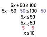 Image 5 « x » plus 50 plus petit ou égal à 100. 5 « x » plus 50 moins 50 plus petit ou égal 100