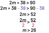 Image 2 « m » plus 38 plus grand que 90. 2 « m » plus 38 moins 38, plus grand que 90 moins 38. 2 « m » plus grand que 52. 2 « m » sur 2, plus grand que 52 sur 2. « m » plus grand que 26.