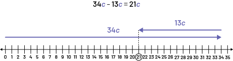 Image Droite numérique avec les valeurs de zéro à 35, la valeur 21 étant encerclée. Une flèche pointe vers la droite de la valeur zéro à 34 et une flèche pointe vers la gauche de 35 à 21. Équation : 34 "c", moins 13 "c", égale 21 "c".