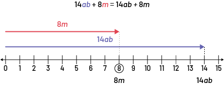 Image Droit numérique avec les valeurs de zéro à 15 et la valeur 8 est encerclée. Une flèche rouge pointe vers la droite à partir de la valeur zéro jusqu'à 8. Une flèche bleue pointe vers la droite à partir de la valeur zéro jusqu'à 14. Équation: 14 "a" "b", plus 8 "m", est égal à 14 "a" "b", plus 8 "m".