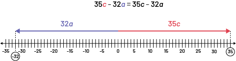 Image Droite numeric avec les valeurs de moins 35 jusqu'à 35. Les valeurs moins 32 et 35 sont encerclées. Une flèche bleue pointe vers la gauche depuis la valeur zéro jusqu'à moins 32 et une flèche rouge pointe vers la droite depuis la valeur zéro jusqu'à la valeur 35. Équation : 35 "c", moins 32 "a", est égal à 35 "c", moins 32 "a".