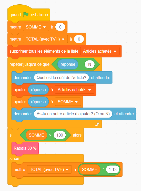 image Blocs de codage attachés les uns aux autres ; Bloc d’évènement : Quand drapeau vert est cliqué. Bloc de variable : mettre « somme » à zéro. Bloc de variable : mettre « total » avec « T » « V » « H » à zéro. Bloc de contrôle : répéter jusqu’à ce que « réponse égale « N » ». Bloc de capteur : demander « quel est le coût de l’article ? et attendre. Bloc de variable de ma liste : ajouter « réponse » à articles achetés. Bloc de variable : ajouter « réponse » à « somme ». Bloc de capteur : demander « as-tu un autre article à ajouter ? « O » ou « N », et attendre. Répéter. Bloc de contrôle : Si « somme plus grand que 100 » alors. Mes blocs : rabais 30 pourcent. Bloc de contrôle : sinon. Bloc variable : mettre « total avec « T » « V » « H », à « somme, multiplié par un virgule 13 ».