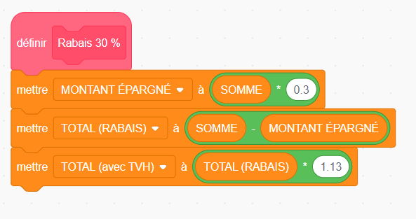 image Blocs de codage attachés les uns aux autres : Mes blocs : définir « rabais 30 pour cent ». Bloc variable : mettre « montant épargné » à « somme multiplié par zéro virgule 3 ». Bloc de variable : mettre « total, rabais » à « somme moins montant épargné ». Bloc de variable : mettre « total, avec « T » « V » « H » » à « total rabais, multiplié par un virgule 13.Demander aux élèves d’ajouter des sous-programmes qu’elles et ils croient pertinents pour le fonctionnement du code. Par exemple :