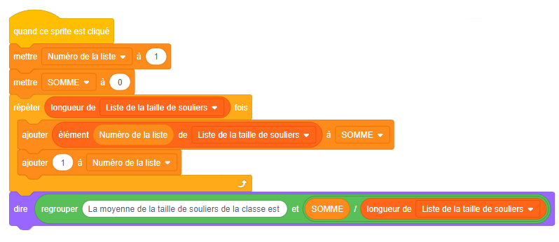 image Blocs de codage attachés les uns avec les autres. Bloc d’évènement : quand ce Sprite est cliqué. Bloc de variable : mettre « numéro de la liste » à un. Bloc de variable : mettre « somme » à zéro. Bloc de contrôle : répéter « longueur de liste de la taille de souliers, fois. Bloc de variable : ajouter « élément « numéro de la liste » de « liste de la taille de souliers » à somme ». Bloc de variable : ajouter un à « numéro de la liste » Répéter. Bloc d’apparence : dire « regrouper » « la moyenne de la taille de souliers de la classe est » et « somme » divisé par « longueur de « liste de la taille de souliers »