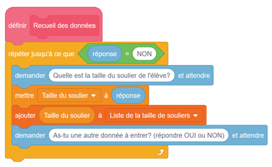image Blocs de codage attachés les uns avec les autres. Mes blocs : définir « recueil des données ». Bloc de contrôle : répéter jusqu’à ce que « réponse égale « non » ». Bloc de capteur : demander « quelle est la taille du soulier de l’élève ? » et attendre. Bloc de variable : mettre « taille du soulier » à « réponse ». Bloc de variable de ma liste : ajouter « taille du soulier »à « liste de la taille de souliers ». Bloc de capteur : demander « as-tu une autre donnée à entrer ? « Répondre oui ou non ». Et attendre, Répéter.