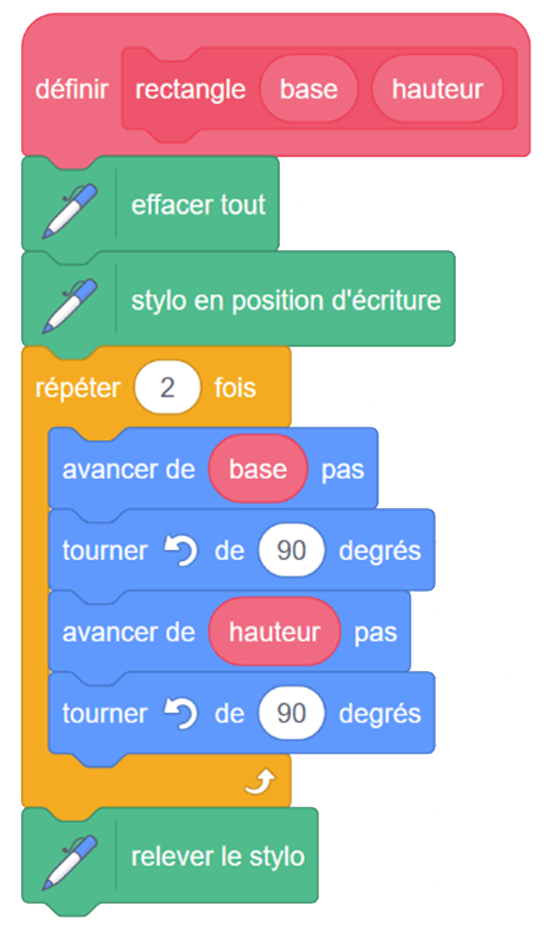 image Blocs de codage attachés les uns aux autres. Mes blocs : définir « rectangle, base, hauteur ». Bloc stylo : effacer tout. Bloc stylo : stylo en position d’écriture. Bloc de contrôle : répéter 2 fois. 4 Blocs de mouvement : avancer de, base, pas. Tourner vers la gauche de 90 degrés. Avancer de, hauteur, pas. Tourner vers la gauche de 90 degrés. Répéter. Bloc stylo : relever le stylo.