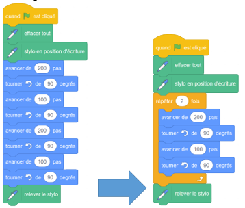 image Blocs de codage attachés les uns aux autres : Bloc d’évènement : quand drapeau vert est cliqué. Bloc stylo : effacer tout. Bloc stylo : stylo en position d’écriture. 8 blocs de mouvement : avancer de 200 pas. Tourner vers la gauche de 90 degrés. Avancer de 100 pas. Tourner vers la gauche de 90 degrés. Avancer de 200 pas. Tourner vers la gauche de 90 degrés. Avancer de 100 pas. Tourner vers la gauche de 90 degrés. Bloc de stylo : relever le stylo. Une flèche nous pointe ce bloc : Blocs de codage attachés les uns aux autres : Bloc d’évènement : quand drapeau vert est cliqué. Bloc stylo : effacer tout. Bloc stylo : stylo en position d’écriture. Bloc de contrôle : répéter 2 fois. Blocs de mouvement : avancer de 200 pas. Tourner vers la gauche de 90 degrés. Avancer de 100 pas. Tourner vers la gauche de 90 degrés. Répéter. Bloc stylo : relever le stylo.
