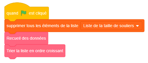 image Blocs de codage attachés les uns aux autres. Bloc d’évènement : quand drapeau vert cliqué. Bloc de variable de ma liste : supprimer tous les éléments de la liste « liste de la taille de souliers. » Mes blocs : recueil de données. Mes blocs : trier la liste en ordre croissant.