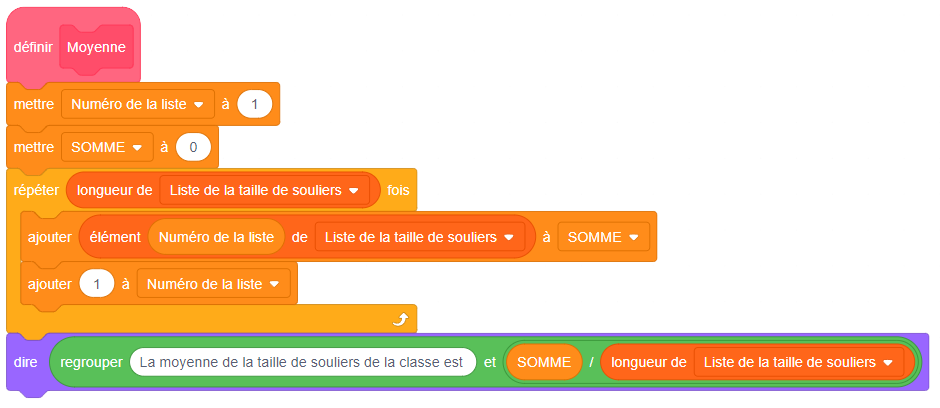 image Blocs de codage attachés les uns aux les autres. Bloc de variable : mettre « numéro de la liste » à un. Bloc de variable : mettre « somme » à zéro. Bloc de contrôle : répéter « longueur de « liste de la taille de souliers » à « somme ». » Bloc de variable : ajouter « élément « numéro de la liste » de « liste de la taille de souliers » à « somme ». » Bloc de variable : ajouter un à « numéro de la liste ». Répéter. Bloc d’apparence : dire « regrouper « la moyenne de la taille de souliers de la classe est » et « somme » divisé par « longueur de « liste de la taille de souliers ». »