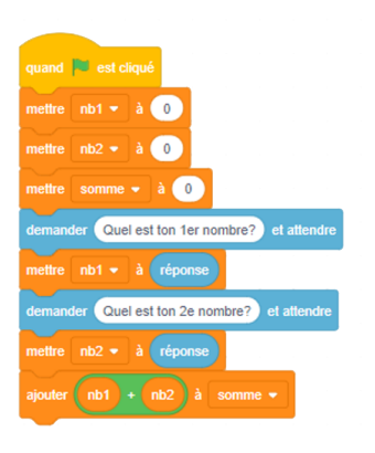 Sans les blocs « mettre à 0 », toutes les variables qui ont été définies lors de la dernière exécution du code demeureront actives. Cela pourrait avoir des effets indésirables sur le comportement du code. C’est un peu comme appuyer sur la touche « CE » d’une calculatrice. - Quel serait le code, dans un logiciel de programmation par blocs, pour ce pseudocode?