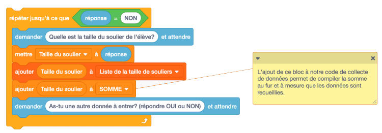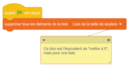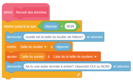 données ». Bloc de variable : mettre « nombre de données de tailles de souliers à entrer » à zéro. Bloc de