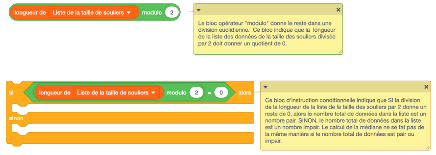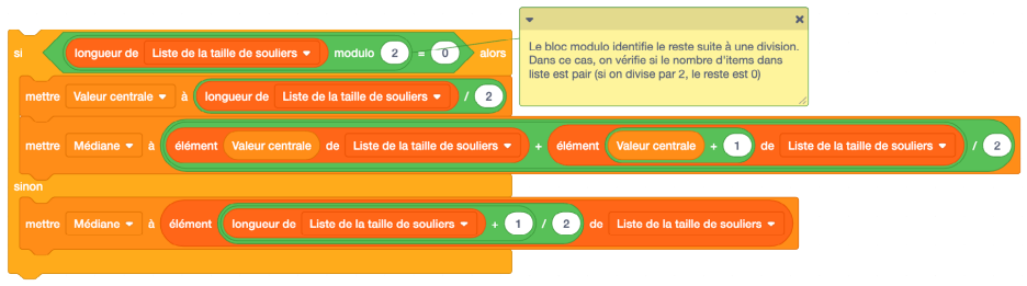 Demander aux élèves d’expliquer l’avantage de créer un code lié aux mesures de tendance centrale dans un logiciel de codage par blocs, au lieu d’utiliser des commandes =MOYENNE et =MÉDIANE dans un tableur. (Le codage par blocs nous donne l’occasion de voir ce qui se passe en arrière-scène lorsqu’on utilise des raccourcis dans un tableur. La création de ce code permet d’explorer la puissance de blocs conditionnels (SI, ALORS, SINON) et de boucles (répéter, répéter jusqu’à).