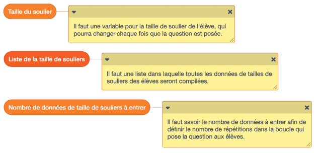 Dans quel bloc peux-tu poser une question? Quelle question peux-tu poser ici? De quelles variables as-tu besoin? image Un bloc de variable : « taille du soulier. » Un papillon adhésif est attaché à ce bloc