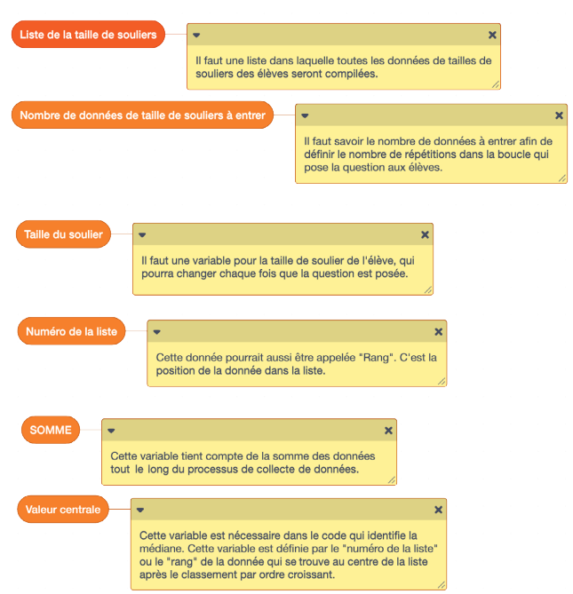 Demander à l’élève ce que veulent dire les variables. La compréhension de la signification des variables utilisées est nécessaire à la compréhension du code. Il est possible que l’élève ne comprenne pas le nom des variables. L’encourager à renommer ses variables avec des termes familiers dans le contexte du problème. image Un bloc de variable de ma liste : « liste de souliers ». Un papillon adhésif est