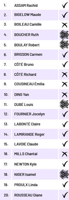 Le tableau contient vingt noms tous associés à cinq cases marquées soit de coches, soit de « X », ou qui sont noircies. Assam, Rachid. Les cinq cases sont cochées. Bigelow, Maude. Les cinq cases sont cochées. Boileau, Camille. Les cinq cases sont marquées d’un « X ». Boucher, Ruth. Les cinq cases sont noircies. Boulay, Robert. Les cinq cases sont noircies. Brisson, Carmen. Les cinq cases sont cochées. Côté, Bruno. Les cinq cases sont cochées. Côté, Richard. Les cinq cases sont marquées d’un « X ». Cousineau, Émilia. Les cinq cases sont marquées d’un « X ». Ding, Yan. Les cinq cases sont marquées d’un « X ». Dubé, Louis. Les cinq cases sont noircies. Fournier, Jocelyn. Les cinq cases sont cochées. Labonté, Claire. Les cinq cases sont cochées. Lamirande, Roger. Les cinq cases sont cochées. Lavoie, Claude. Les cinq cases sont cochées. Mills, Chantal. Les cinq cases sont marquées d’un « X ». Newton, Kyle. Les cinq cases sont cochées. Niger, Ismael. Les cinq cases sont noircies. Proulx, Linda. Les cinq cases sont cochées. Rousseau, Diane. Les cinq cases sont cochées