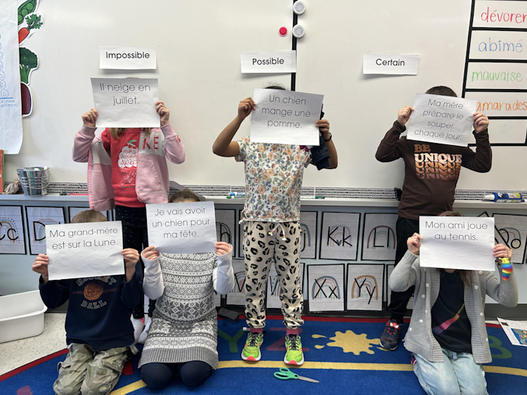 L’enseignante ou l’enseignant affiche au tableau les étiquettes impossible, possible et certain. Elle ou il présente aux élèves une série de fiches sur lesquelles un événement différent est inscrit (par exemple, « Ma grand-mère est sur la Lune. »; « Un chien mange une pomme. »). Elle ou il demande à chaque élève de choisir un événement et de le classer selon l’attribut. Pour représenter ce classement, l’élève doit se placer devant l’étiquette correspondant à la caractéristique choisie.