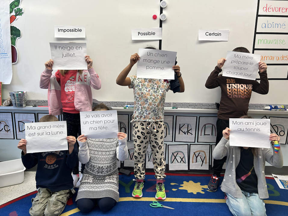 Dans une salle de classe, six élèves se tiennent sous une des trois étiquettes, soit Impossible,