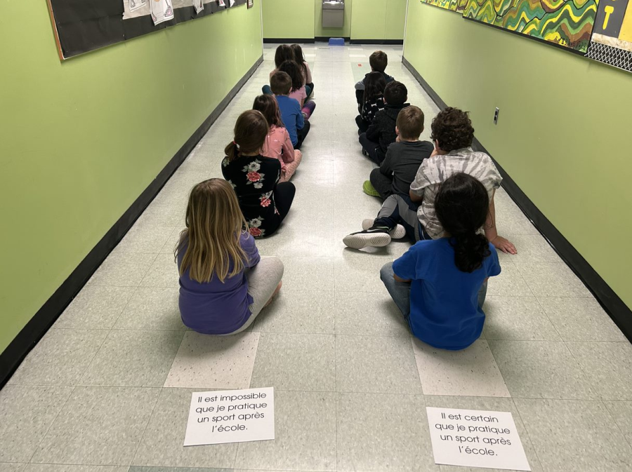 L’enseignante ou l’enseignant affiche au tableau les étiquettes impossible, possible et certain. Elle ou il présente aux élèves une série de fiches sur lesquelles un événement différent est inscrit, par exemple : « Ma grand-mère est sur la Lune. », « Un chien mange une pomme. ». Elle ou il demande à chaque élève de choisir un événement et de le classer selon l’attribut certitude. Pour représenter ce classement, l’élève doit se placer devant l’étiquette correspondant à la caractéristique choisie.