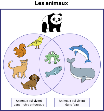 - le panda ne fait pas partie des ensembles « Animaux qui vivent dans notre entourage » et « Animaux qui vivent dans l’eau », mais il est un élément de l’ensemble de référence « Les animaux ».