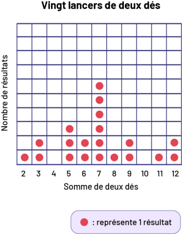 Image Diagramme avec illustrations, présenté sous forme de grille de 10 x 11, dont le titre est Vingt lancers de deux dés. Titre de l’axe vertical : Nombre de résultatsTitre de l’axe horizontal : Somme de deux désL’axe horizontal est numéroté de 2 jusqu’à 12.2 : un jeton rouge3 : deux jetons rouges4 : pas de jeton 5 : trois jetons rouges6 : deux jetons rouges7 : six jetons rouges8 : un jeton rouge9 : deux jetons rouges10 : pas de jeton11 : un jeton rouge12 : deux jetons rougesLégende : un jeton rouge représente un résultat.