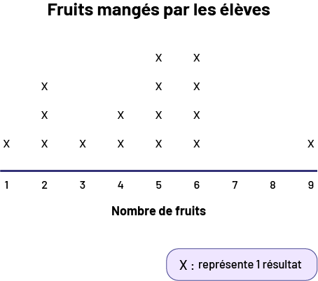 Image Ligne de dénombrement, dont le titre est Fruits mangés par les élèves, et l’axe horizontal, Nombre de fruits. L’axe horizontal est numéroté de 1 jusqu’à 9.1 : un X2 : trois X3 : un X4 : deux X5 : quatre X6 : quatre X7 : pas de X8 : pas de X9 : un XLégende : un X représente un résultat.