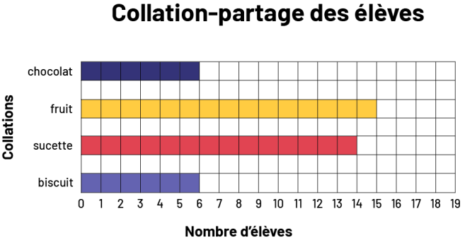 Image Diagramme à bandes horizontales, dont le titre est Collation-partage des élèves. Titre de l’axe vertical :CollationsL’axe vertical présente quatre catégories : Chocolat, Fruit, Sucette et Biscuit. Titre de l’axe horizontal : Nombre d’élèvesL’axe horizontal est numéroté de 0 à 19.La bande bleue, relative au chocolat, correspond à 6 élèves.La bande jaune, relative à un fruit, correspond à 15 élèves.La bande rouge, relative à une sucette, correspond à 14 élèves.La bande violette, relative à un biscuit, correspond à 6 élèves.