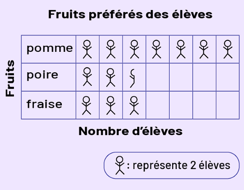 d’élèves ». Trois fruits sont nommés : pomme, poire et fraise. Un bonhomme allumette représente deux élèves.