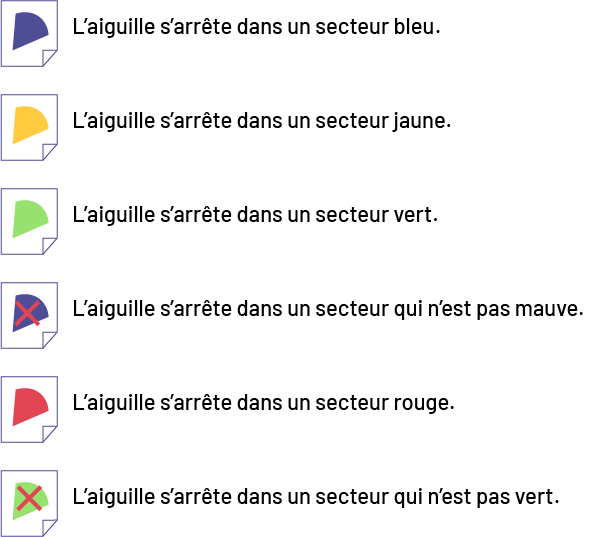 D’autres élèves ont de la difficulté à faire la distinction entre les caractéristiques jamais et impossible. Il leur est difficile de comprendre que même si un événement impossible est un événement qui ne peut jamais se produire, par contre, un événement qui ne s’est jamais produit n’est pas nécessairement impossible. À titre d’exemple, il est impossible que l’aiguille de la roulette dans l’exemple précédent s’arrête dans un secteur jaune. Donc, même si on la fait tourner 100 fois, elle ne s’arrêtera jamais dans un secteur jaune. Par contre, même si après 100 essais, l’aiguille ne s’est jamais arrêtée dans un secteur vert, cela ne veut pas nécessairement dire que ce résultat est impossible.