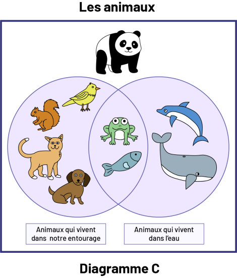 Diagramme C a pour titre : Les animaux. Un panda est illustré au-dessus d’un diagramme de Venn à deux cercles.