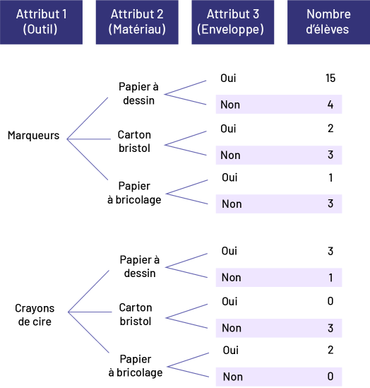 L’attribut 1, l’outil, présente deux options : marqueurs ou crayons de cire. L’attribut deux, le matériau, présente 3