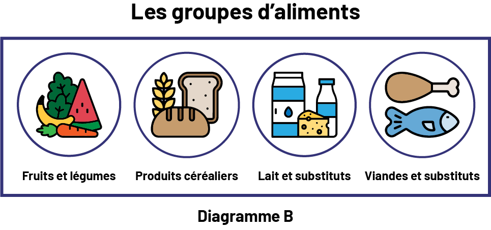 Le diagramme B est une illustration ayant pour titre « Les groupes d’aliments », qui présente 4 images associées à