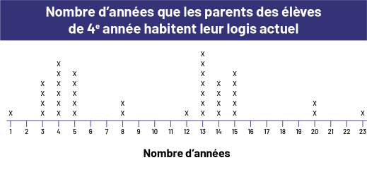 Le personnel enseignant demande à ses élèves de vérifier depuis combien d’années leurs parents demeurent dans leur logis actuel. Les résultats sont représentés par la ligne de dénombrement suivante.