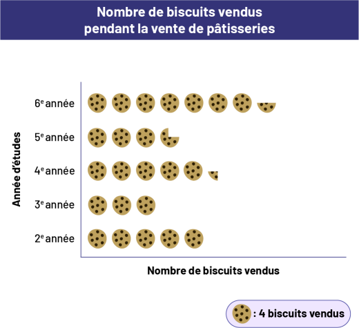 que chaque pictogramme de biscuit équivaut à 4 biscuits vendus. La deuxième année affiche 5 biscuits. La troisième