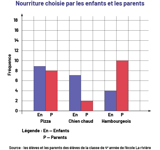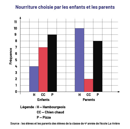 Image Le diagramme à 6 bandes colorées s’intitule : « Nourriture choisie par les enfants et les parents ». La source provient des élèves et des parents des élèves de la classe de quatrième année de l’école La Rivière. Légende : La lettre H signifie hambourgeois, les lettres CC signifient chien chaud et la lettre P signifie pizza. L’axe vertical présente ces lettres énoncées par les enfants, puis par les parents. L’axe vertical correspond à la fréquence. Du côté des enfants, la bande violette correspondant à H s’élève à 4. La bande rouge correspondant à CC s’élève à 7. La bande noire correspondant à P s’élève à 9. Du côté des parents, la bande violette correspondant à H s’élève à 10. La bande rouge correspondant à CC s’élève à deux. Et la bande noire correspondant à P s’élève à 8. Image Le diagramme à 6 bandes violettes et rouges s’intitule : « Nourriture choisie par les enfants et les parents ». La source provient des élèves et des parents des élèves de la classe de quatrième année de l’école La Rivière. Légende : E N égale enfants. CC égale chien chaud. L’axe horizontal présente les mets pizza, chien chaud et hambourgeois choisis par les enfants, puis par les parents. L’axe vertical correspond à la fréquence. Pour la pizza, la bande violette nommée EN monte jusqu’à 9. La bande rouge nommée P monte jusqu’à 8. Pour les chiens chauds, la bande violette EN monte jusqu’à 7, et la bande rouge P monte jusqu’à deux. Pour les hambourgeois, la bande violette EN monte jusqu’à 4, tandis que la bande rouge P monte jusqu’à dix.