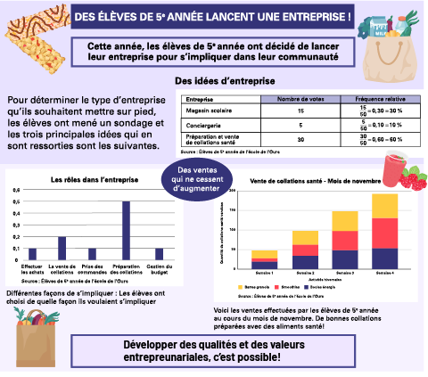 image Le titre de l’infographie est : Des élèves de 5e année lancent une entreprise!Le sous-titre est : Cette année, les élèves de 5e année ont décidé de lancer leur entreprise pour s’impliquer dans leur communauté.Texte : Pour déterminer le type d’entreprise qu’ils souhaitent mettre sur pied, les élèves ont mené un sondage, et les trois principales idées qui en sont ressorties sont les suivantes. Il y a trois graphiques. Le premier graphique s’intitule : Des idées d’entreprise. Il s’agit d’un tableau composé de trois colonnes et de trois rangées. Les titres des colonnes sont : « Entreprise », « Nombre de votes » et « Fréquence relative ». Rangée 1 : magasin scolaire, 15 votes, 30 %; rangée 2 : conciergerie, 5 votes, 10 %; rangée 3 : préparation et vente de collations santé, 30 votes, 60 %. Le deuxième graphique s’intitule : Les rôles dans l’entreprise. Il s’agit d’un diagramme à bandes. L’axe des x comprend cinq bandes, soit : Effectuer les achats; La vente de collations; Prises des commandes; Préparation des collations; et Gestion du budget.L’axe des y est divisé en dixièmes. Il est gradué de 0 à six dixièmes.Sous l’axe des x, il est écrit « Source : Élèves de 5e année de l’école de l’Ours ».Sous le deuxième graphique, il est écrit : « Différentes façons de s’impliquer : Les élèves ont choisi de quelle façon ils voulaient s’impliquer. »Près du troisième graphique, il y a une bulle dans laquelle il est écrit « Des ventes qui ne cessent d’augmenter ». Le troisième graphique est un diagramme à bandes empilées. Le titre est « Vente de collations santé – Mois de novembre ». Le titre de l’axe des x est : Activités hivernales. L’axe est gradué en semaines : Semaine 1, Semaine 2, Semaine 3 et Semaine 4. Le titre de l’axe des y est : Quantité de collations santé vendues. L’axe est gradué par 50, de 0 à 200. Les collations sont : barres granola, smoothies, barres énergie.Sous l’axe des x, il est écrit « Source : Élèves de 5e année de l’école de l’Ours ».Sous le troisième graphique, il est écrit : « Voici les ventes effectuées par les élèves de 5e année au cours du mois de novembre. De bonnes collations préparées avec des aliments santé! »Conclusion : Développer des qualités et des valeurs entrepreneuriales, c’est possible!